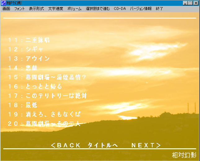 相対幻影』ちまちま製作中。取り敢えずのシステムで全部読もうと思ったけれど、一気に全部読める量じゃありませんでした。いきなり自分で挫折感を味わいながら、第一章の調整をはじめました。背景画像をそろえて(まだ全部揃ってないけど)、背景と文章だけの状態に持ってくることに成功。これなら、体験版は予定より早く公開できそうです。毎日このペースで作業すればね!(不穏)。